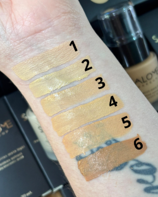 Es fácil de difuminar, deja el rostro suave y matte. Es de larga duración y tiene una cobertura media-alta. Viene en 6 tonos.