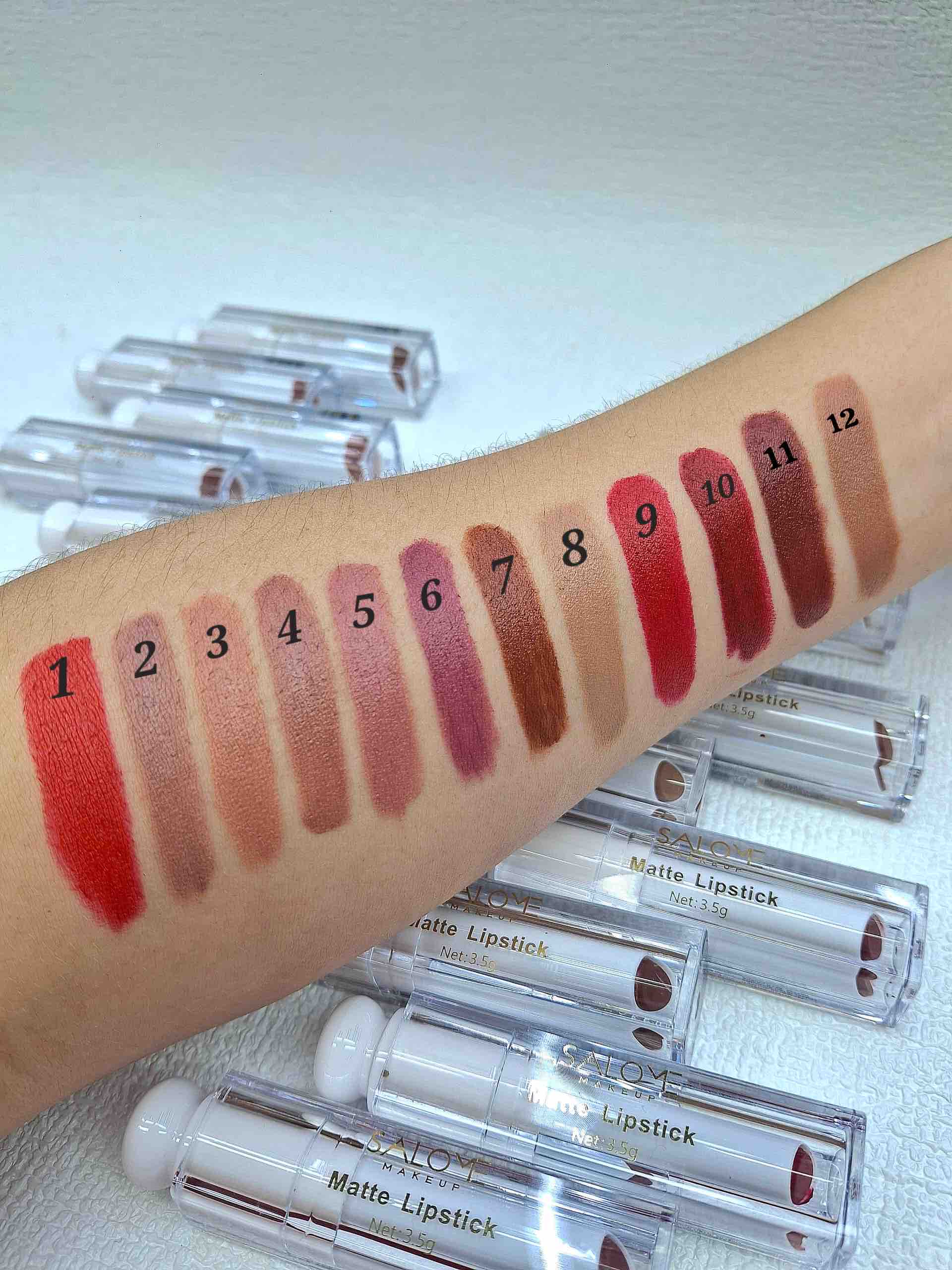 Labial de acabado matte, con fórmula hidratante, larga duración. Vienen en 12 tonos que van desde nude, a rojos y vinos.