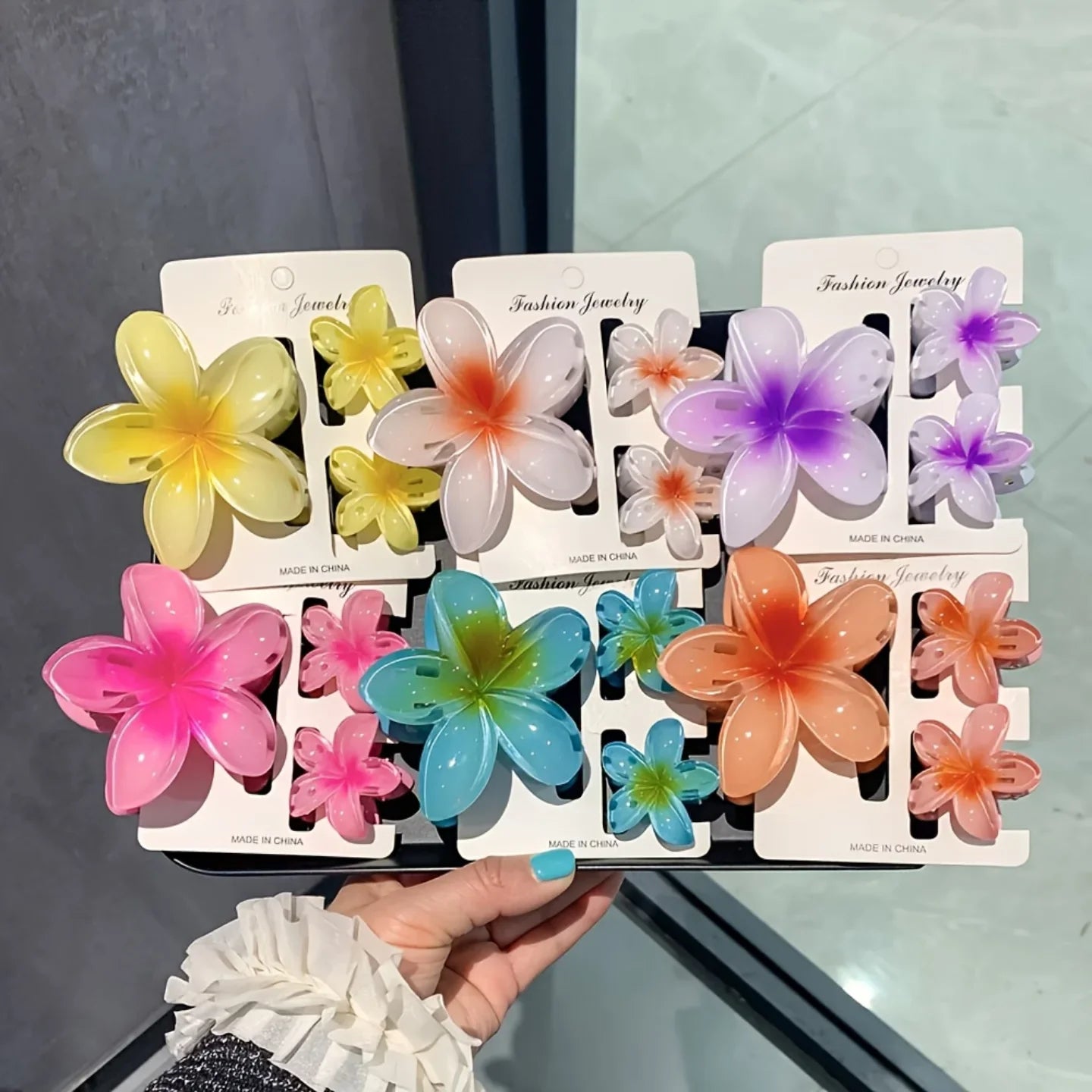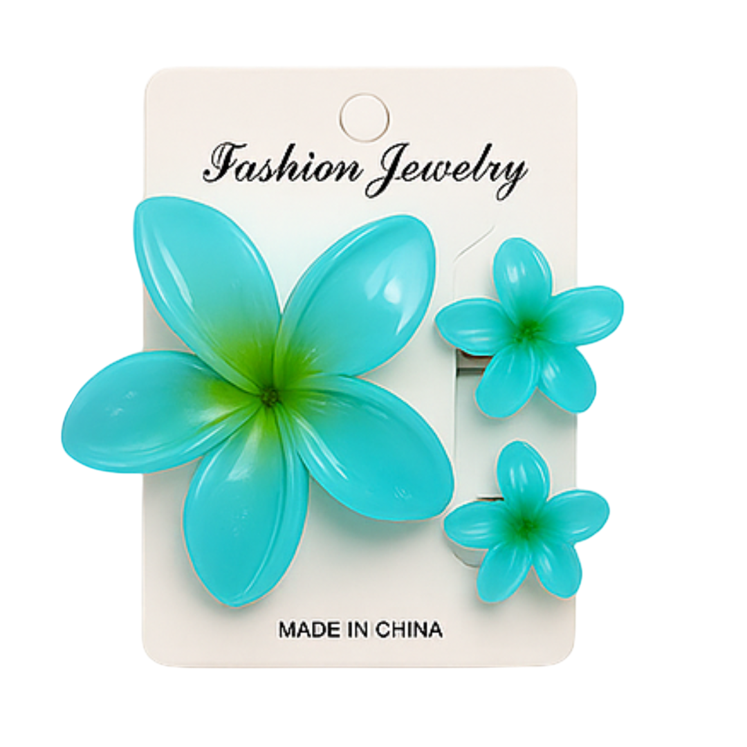 Estas pinzas de cabello tienen forma de flor tropical con cinco pétalos, elaboradas en un material plástico translúcido que les da un acabado ligero y brillante. Cada flor presenta un diseño con un color intenso en el centro que se difumina suavemente hacia un tono transparente en los extremos de los pétalos, creando un efecto degradado elegante y delicado. Viene en 6 colores.